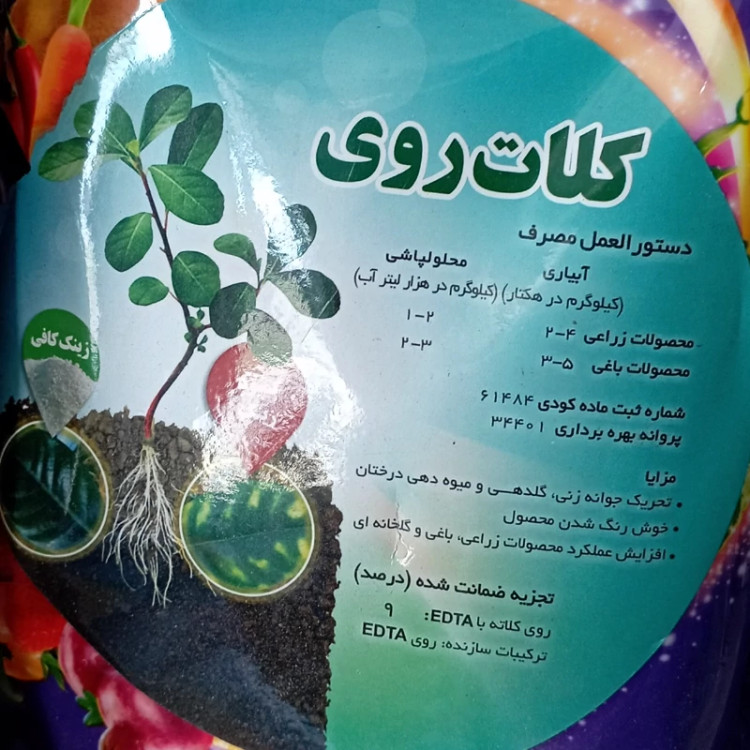 شماره ثبت ماده کودي: 045656 مزایا: حاوي 9درصد روي کلات شده و قابل جذب براي گیاه .تحریک جوانه زنی، گلدهی و میوه دهی در گیاهان . رشد بهینه محصول، رسیدن و همچنین رنگ مناسب یا خوش رنگی . موثر بر تشکیل کربوهیدرات ها، افزایش پروتئین و تحریک تشکیل بذر . افزایش عملکرد محصولات زراعی، باغی و گلخانه اي تجزیه ی ضمانت شده (بر حسب درصد وزنی) : روي ﮐﻼﺗﻪ ﺑا EDTAر (Zn) 9٪